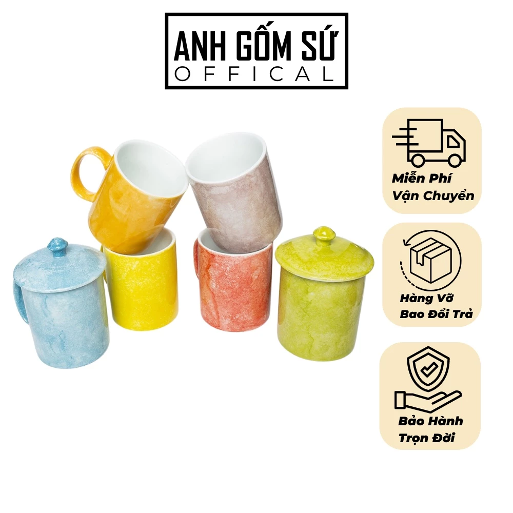 Bat Trang Stone Glaze Ceramic Mug with Lid and Handle, 350ml - Lemon Yellow (Premium Vietnamese Pottery)