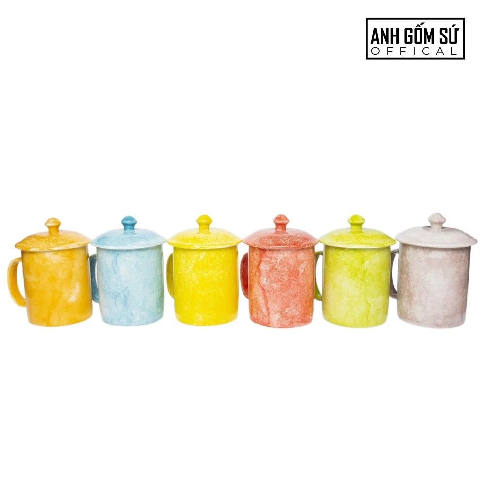Bat Trang Stone Glaze Pink Ceramic Mug with Lid & Handle, Cylindrical, 350ml - Premium Quality