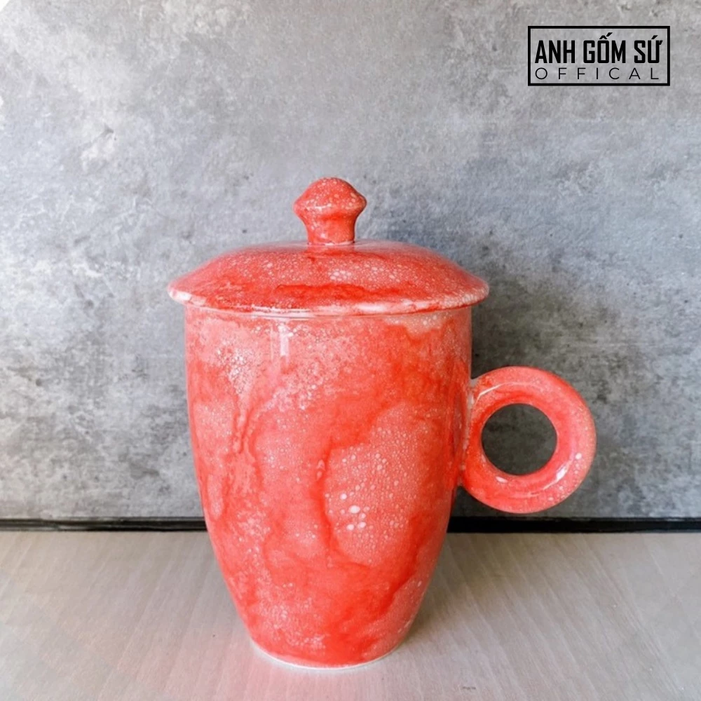 Bát Tràng Authentic Stone Glaze Ceramic Mug with Lid - Red Marble Pattern 330ml