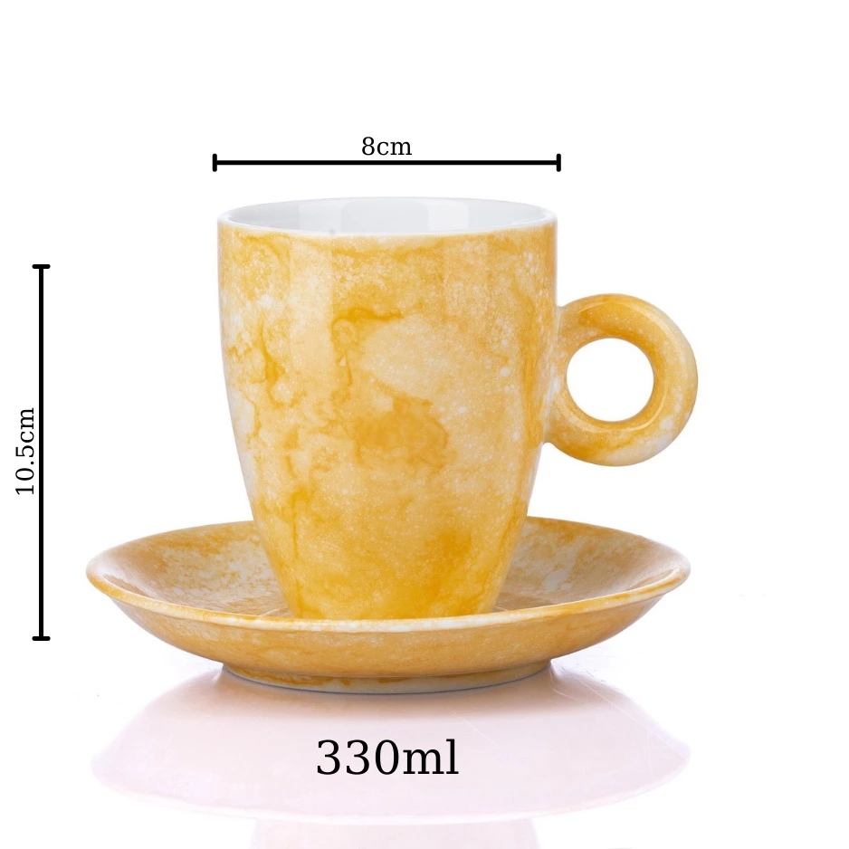 Bat Trang Authentic Handmade Stone Glaze Ceramic Mug with Lid - Unique Tea & Coffee Cup, Orange Stone Marble Pattern, 330ml
