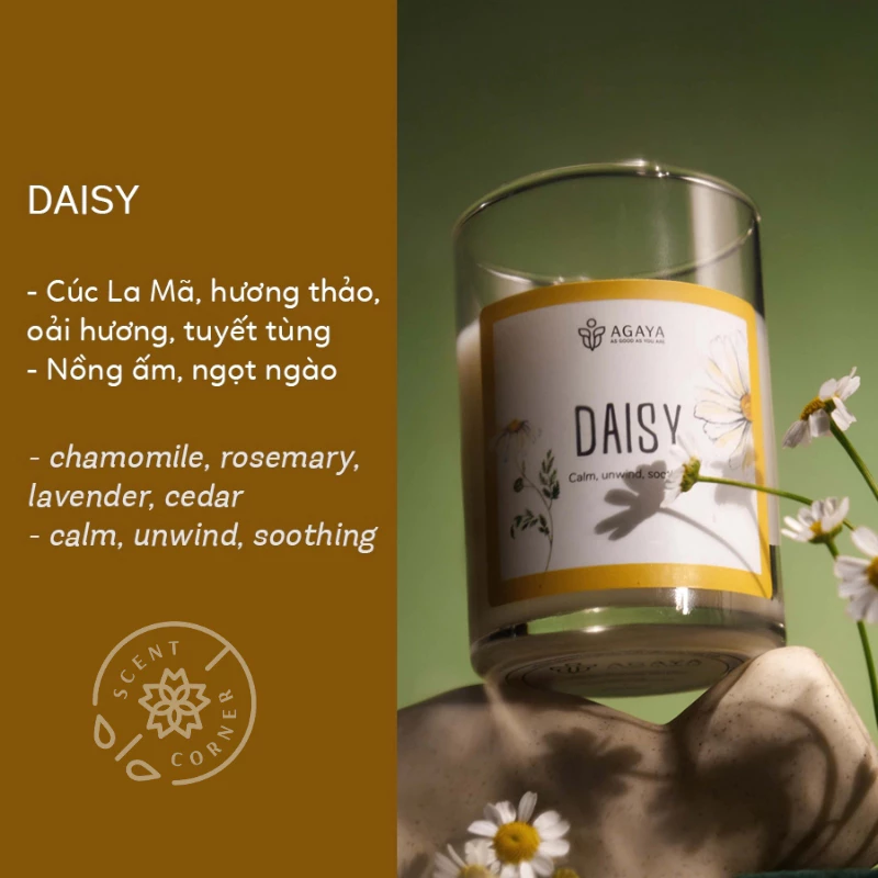 - Daisy: デイジー、ローズマリー、ラベンダー、シダーウッド (愛らしい、穏やか)