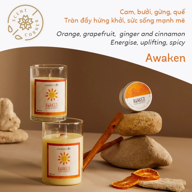 - Awaken: オレンジ、グレープフルーツ、ジンジャー、シナモン (活気に満ち、目覚める)