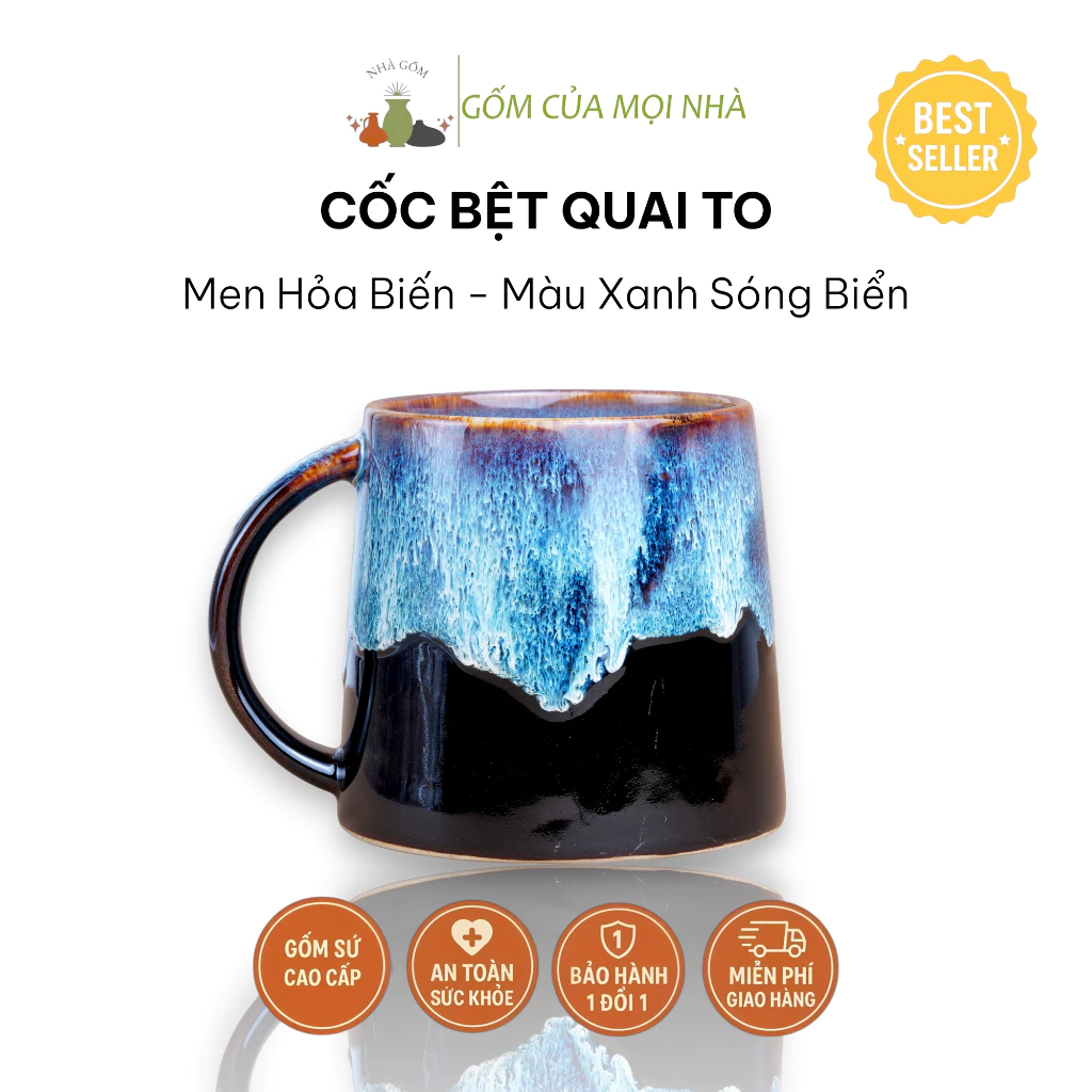 Bat Trang Ceramic Large Handle Mug - Sea Wave Blue Pattern, 500ml for Beer, Coffee, Tea