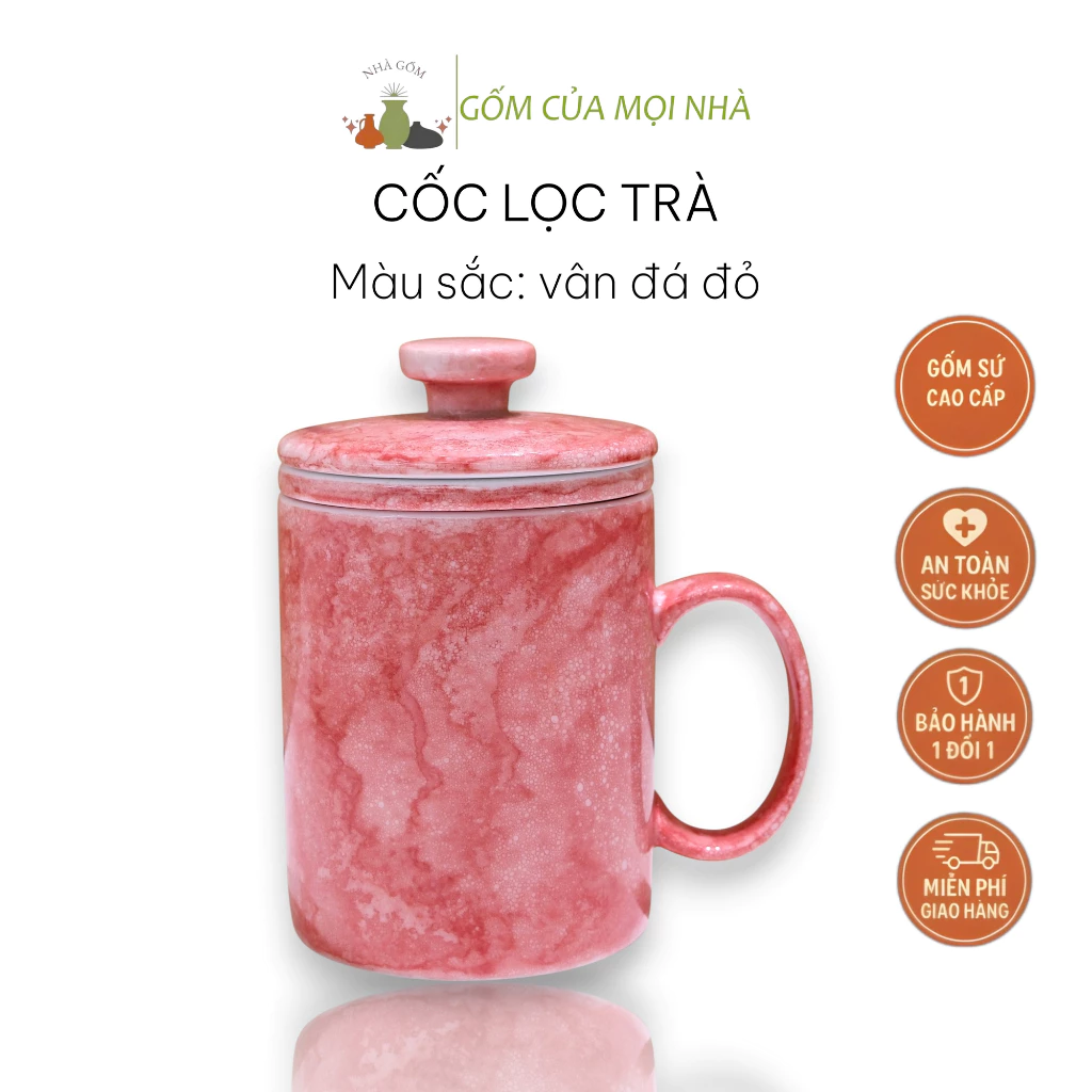 Bat Trang Ceramics Premium Tea Infuser Mug 350ml with Lid & C-Handle - Red Stone Pattern Office Tea Cup
