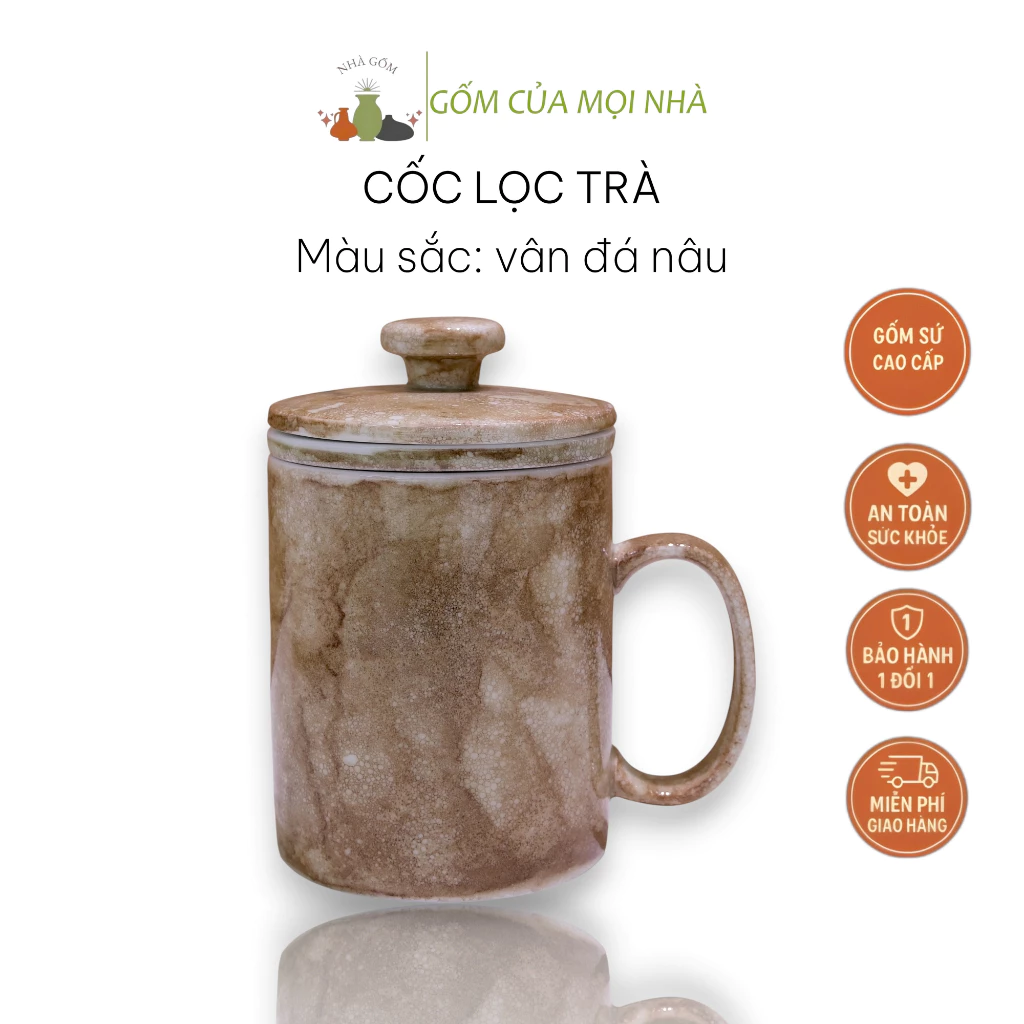 Bát Tràng High-Grade Ceramic Mug with Tea Infuser & Lid - 350ml Office Tea Filter Cup, Stone Brown Pattern