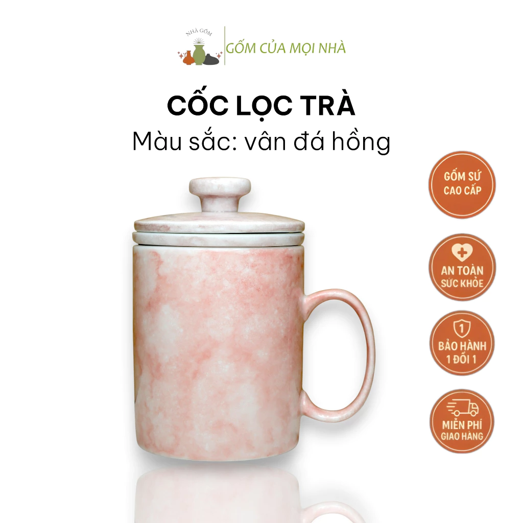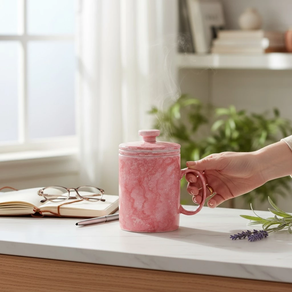 Bat Trang Premium Office Tea Infuser Mug 350ml with Lid and C-Handle - Pink Marble Pattern Ceramic