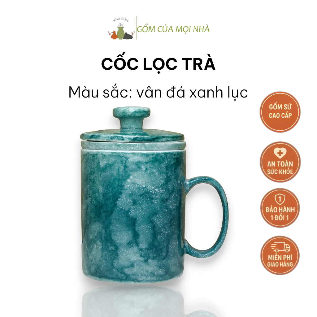 Bat Trang Premium Office Ceramic Tea Mug with Infuser & Lid, C-Handle, 350ml, Green Stone Pattern - For Tea & Water