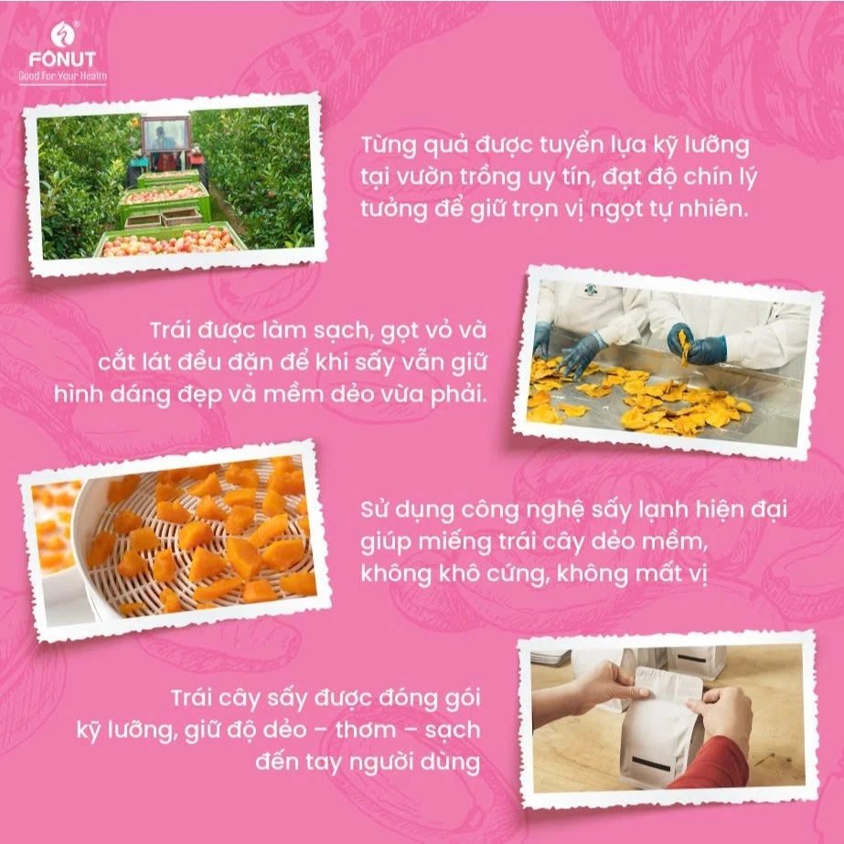 一般的なパリパリに乾燥させたドライフルーツとは異なり、この製法により果物本来のしっとりとした食感と濃厚な味わいをそのまま閉じ込めました。