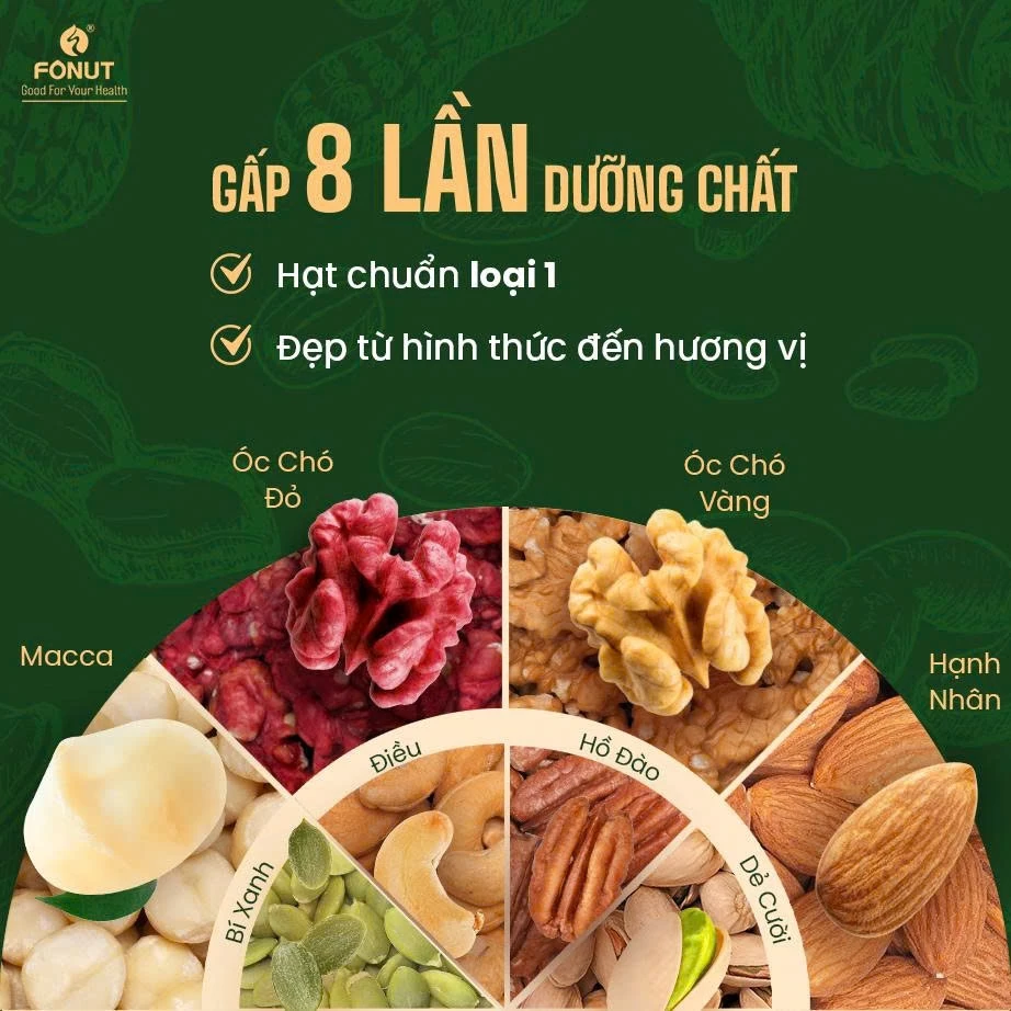 「Fonut 8種ミックス栄養ナッツ」は、8種類の厳選されたナッツとドライフルーツを黄金比でブレンドした、500g入りの栄養満点ミックスです。