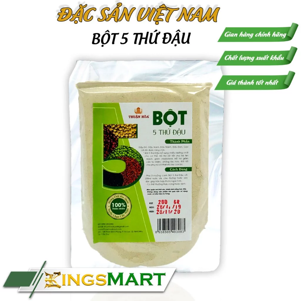 \n「THUẬN HÒA 五穀豆粉 (Bột Ngũ Vị Đậu) 200g」は、ベトナム南部メコンデルタの豊かな大地の恵みを凝縮した、カントーの伝統的な逸品です。THUẬN HÒAブランドは、この地域の農産物の真髄を抽出し、厳選された5種類の豆を絶妙なバランスでブレンドしました。200gのコンパクトな袋入りで、手軽に栄養を補給できる便利な商品です。\n香ばしい豆の香りと、自然なコクのあるまろやかな味わいが特徴で、長きにわたりベトナムの家庭で愛されてきた国民的な健康飲料です。お子様からご年配の方まで、あらゆる世代の健康をサポートします。\n\nこの五穀豆粉は、単なる飲み物以上の、積極的な健康ケアを叶える製品です。\n- \n