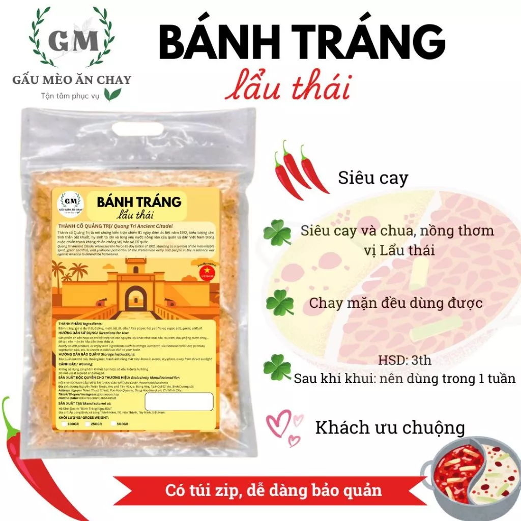 「GẤU MÈO (ガウメオ)」のヴィーガンライスペーパー、タイスキ風味(中辛)は、ベトナムで大人気のヴィーガンおやつです。500g入りのモダンなジップ袋デザインと温かみのあるパッケージには、親しみやすいアライグマのキャラクターが描かれており、洗練された食体験をお届けします。