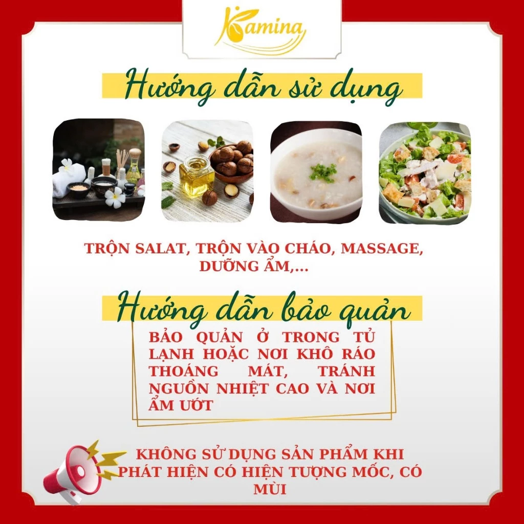 栄養素を最大限に活かすため、カミナ マカダミアオイルは賢くご使用ください。