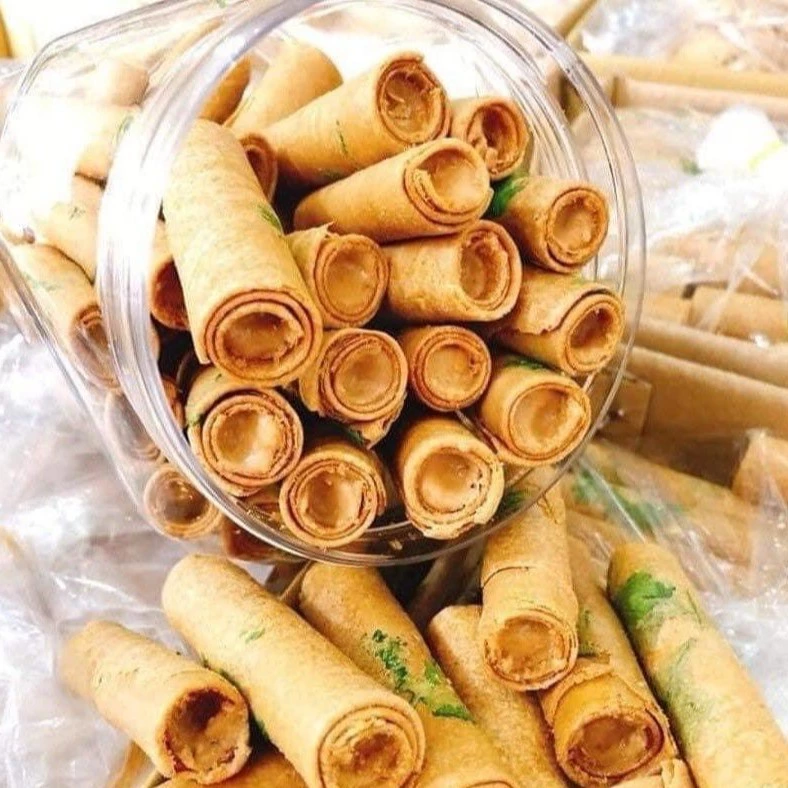 このお菓子は、細長い黄金色のチューブ型で、新鮮なコリアンダーの緑色がアクセントになっています。一口食べると、「果物の王様」と称されるドリアンの濃厚で芳醇な香りが口いっぱいに広がり、その独特の風味があなたを魅了します。