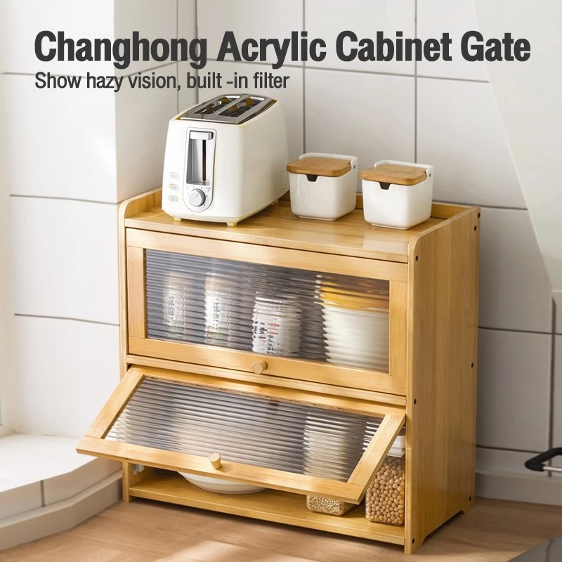 • **隠す収納:** オープンシェルフとは異なり、ドア(通常はガラス製または木製)が付いているため、調理中のホコリや油はねから調味料、お茶、コーヒー、常備薬などをしっかり保護します。
