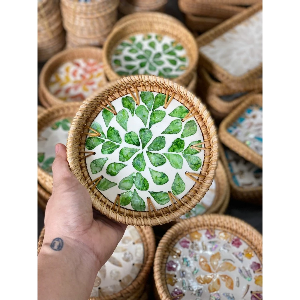 籐製 真珠貝象嵌トレイ 丸型 D15xH3cm - 食卓・キッチン装飾、小物入れ、撮影背景に最適の通販・個人輸入代行販売商品