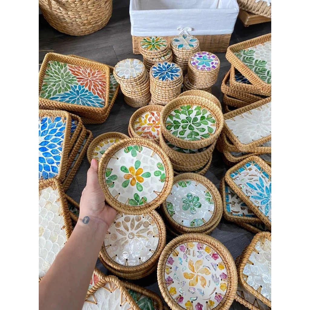このミニサイズの籐製真珠貝象嵌皿は、単なるトレイではありません。精巧な芸術作品です。そのユニークさは皿の内部にあります。丁寧に研磨され、カットされた真珠貝や貝殻の破片が、手編みの籐の表面に直接象嵌されています。小ぶりなミニサイズながらも、豪華さと気品を醸し出しつつ、ベトナムの素朴な田舎の魂も感じさせます。籐の木目や天然の真珠貝の輝きは決して同じものがなく、一つ一つが唯一無二の存在です。
