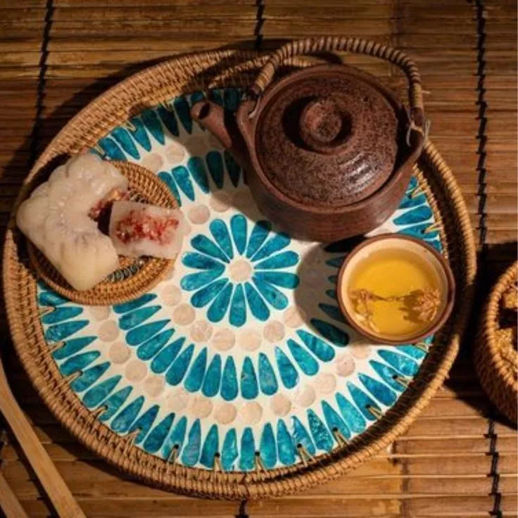 「ラタン螺鈿細工トレイ」は、千年の森のラタンと海の輝きが織りなす、唯一無二のアート作品です。一つ一つ異なる個性を持つこのトレイは、伝統的なラタン編みの技術と、精巧な螺鈿細工の芸術が見事に融合しています。