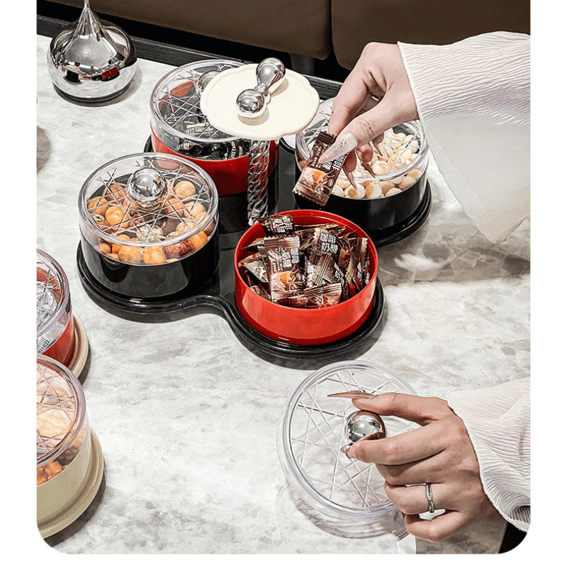 GONHOUSE Premium 360-Degree Rotating Tet Holiday Sweets & Snack Tray Set (Red + Beige) - Dustproof & Moisture-proof Plastic with 4 Compartments