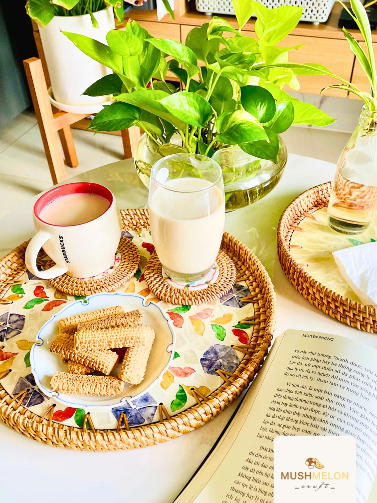 - 厳粛な供物台として:最も素晴らしい活用方法です。広い面積を持つこのトレイは、祖先の祭壇に肉料理や五果盛りを十分に美しく飾ることができます。ラタンと真珠貝の組み合わせは、神聖な空間に純粋で厳かな美しさをもたらします。