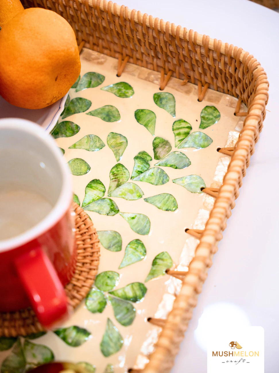 使用方法:重いものを運ぶ際は、トレイの両端をしっかりと持ち、均等に力が分散するようにしてください。高級コーティングが施されているため、熱い食器を直接置いても真珠貝象嵌に影響はありません。お手入れ:日常のほこり取りには、柔らかく乾いた布をご使用ください。食べ物の汚れが付着した場合は、湿らせた布で拭き取り、すぐに乾いた布で拭き直してください。ラタンの編み目の隙間に水が溜まるのを防ぐため、直接水を吹きかけないでください。