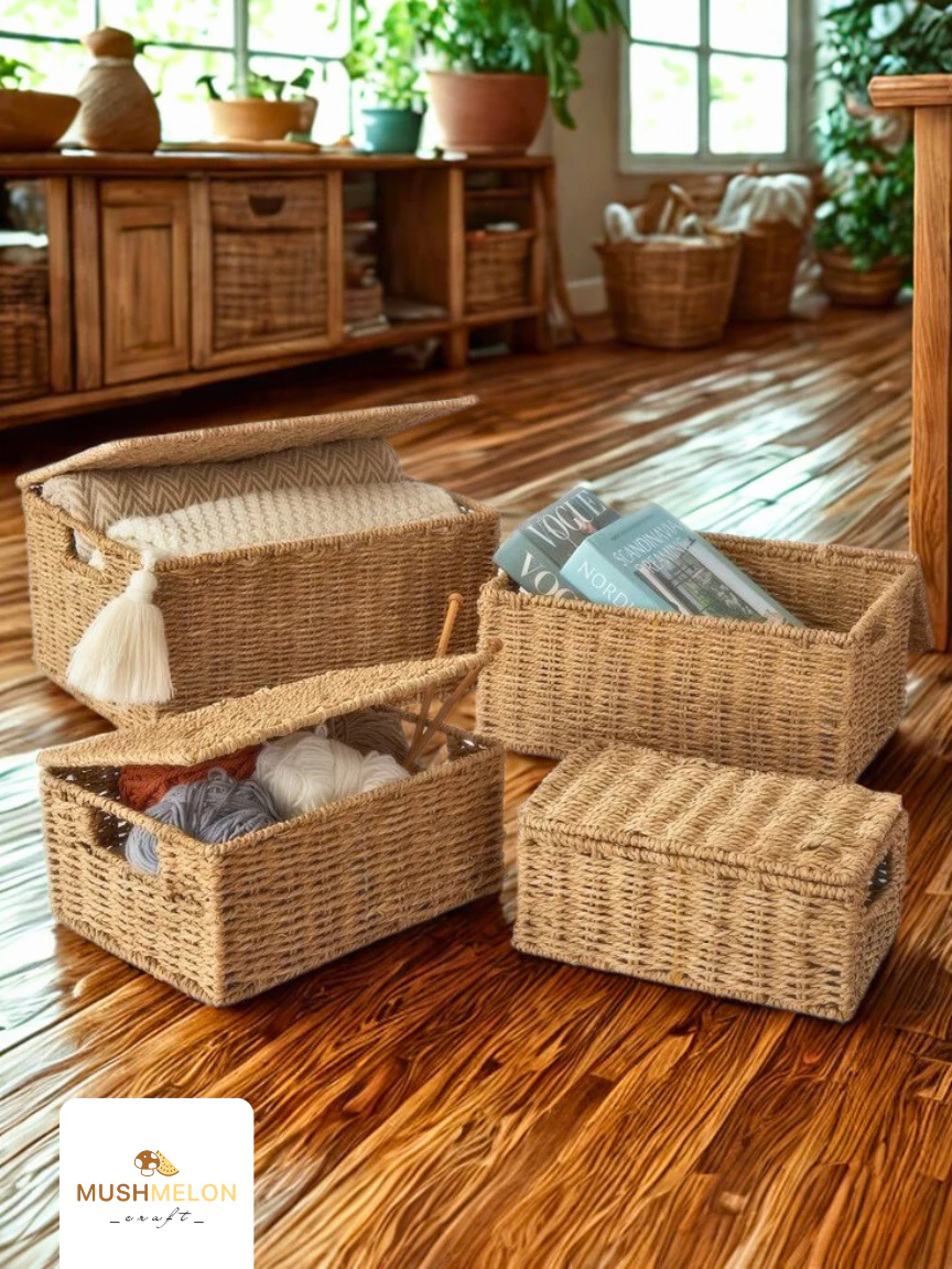 Handmade Seagrass Rectangular Lidded Basket (Size S) - Storage, Shelf Decor, Christmas & Housewarming Gift, Home Organization