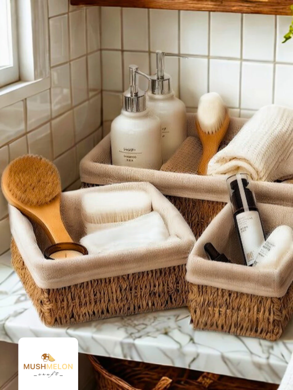 • 手作りの留め具と蝶番: バスケットのフタは、シーグラスを編んだ紐や繊細な結び目で本体と接続され、木製またはラタン製の留め具が付いています。開けるたびに懐かしさと遊び心を感じさせる、魅力的なディテールです。