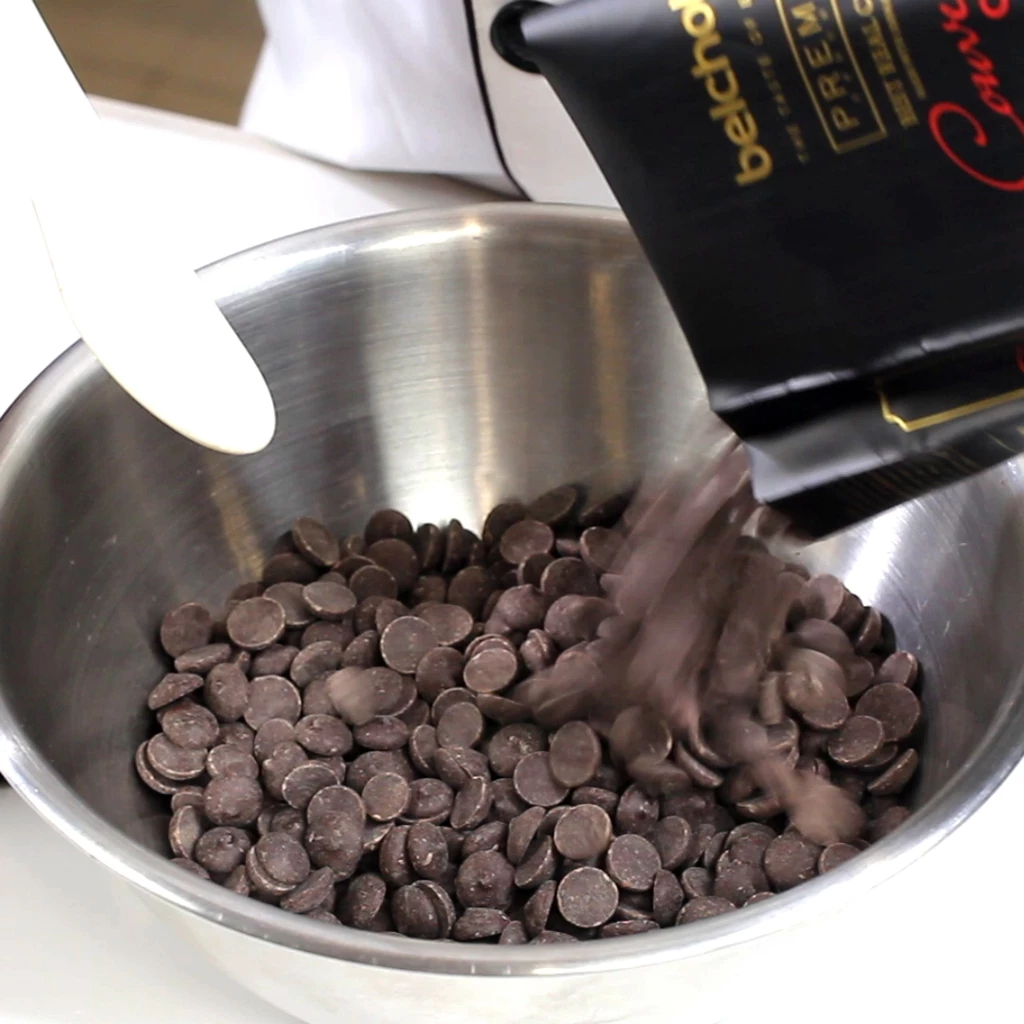 - 溶解:湯煎または電子レンジ(低温)で溶かすことができます。水がチョコレートに入らないように注意し、ココアバターが焦げ付かないように高温で加熱しすぎないでください。