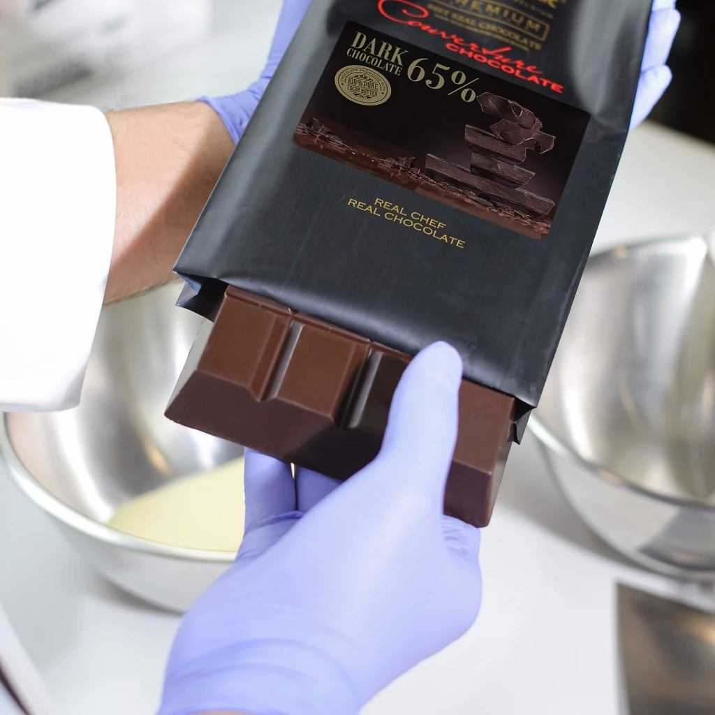 ・製菓店で:濃厚なチョコレートケーキの生地、豪華なボンボンの型流し、艶やかなケーキのグラサージュに最適です。65%の深みは、焼成後もカカオ本来の豊かな風味をしっかりと保持します。
