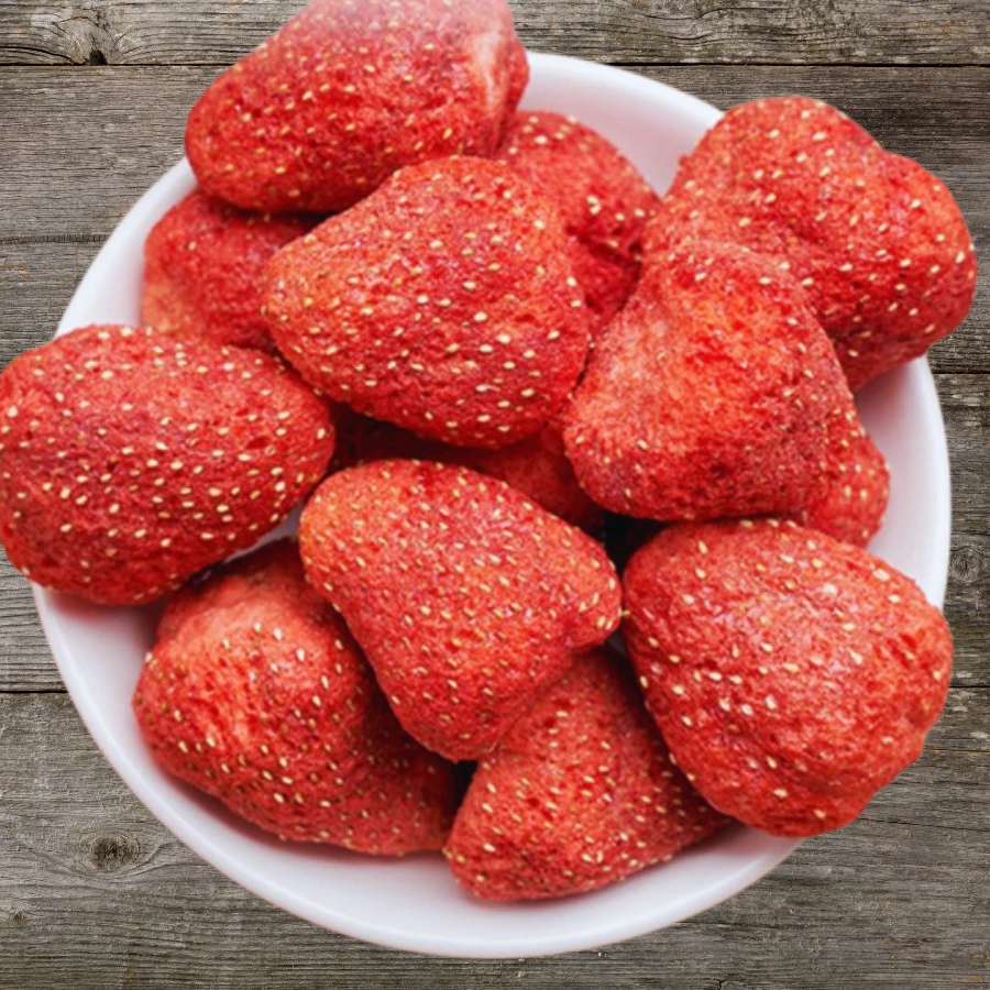 最先端のフリーズドライ技術(freeze-dried)により、いちご本来の丸く、ふっくらとした、鮮やかな赤色をそのままに保ちます。一般的な熱乾燥で起こりがちな形の変形や色の劣化はありません。
