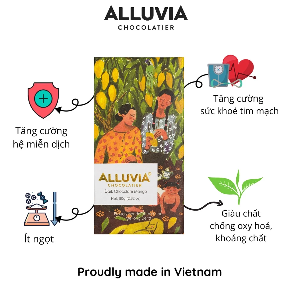 このAlluvia マンゴー入りダークチョコレートは、単なるお菓子ではなく、ベトナムの農産物を新たな高みへと導く旅です。カカオの苦味、マンゴーの酸味——すべてが溶け合い、豊かなメコンデルタの物語を語りかけます。