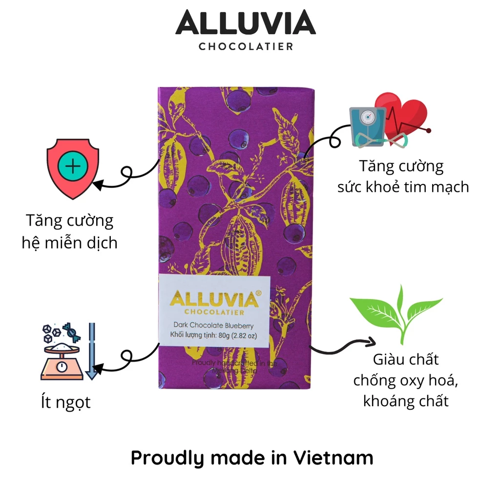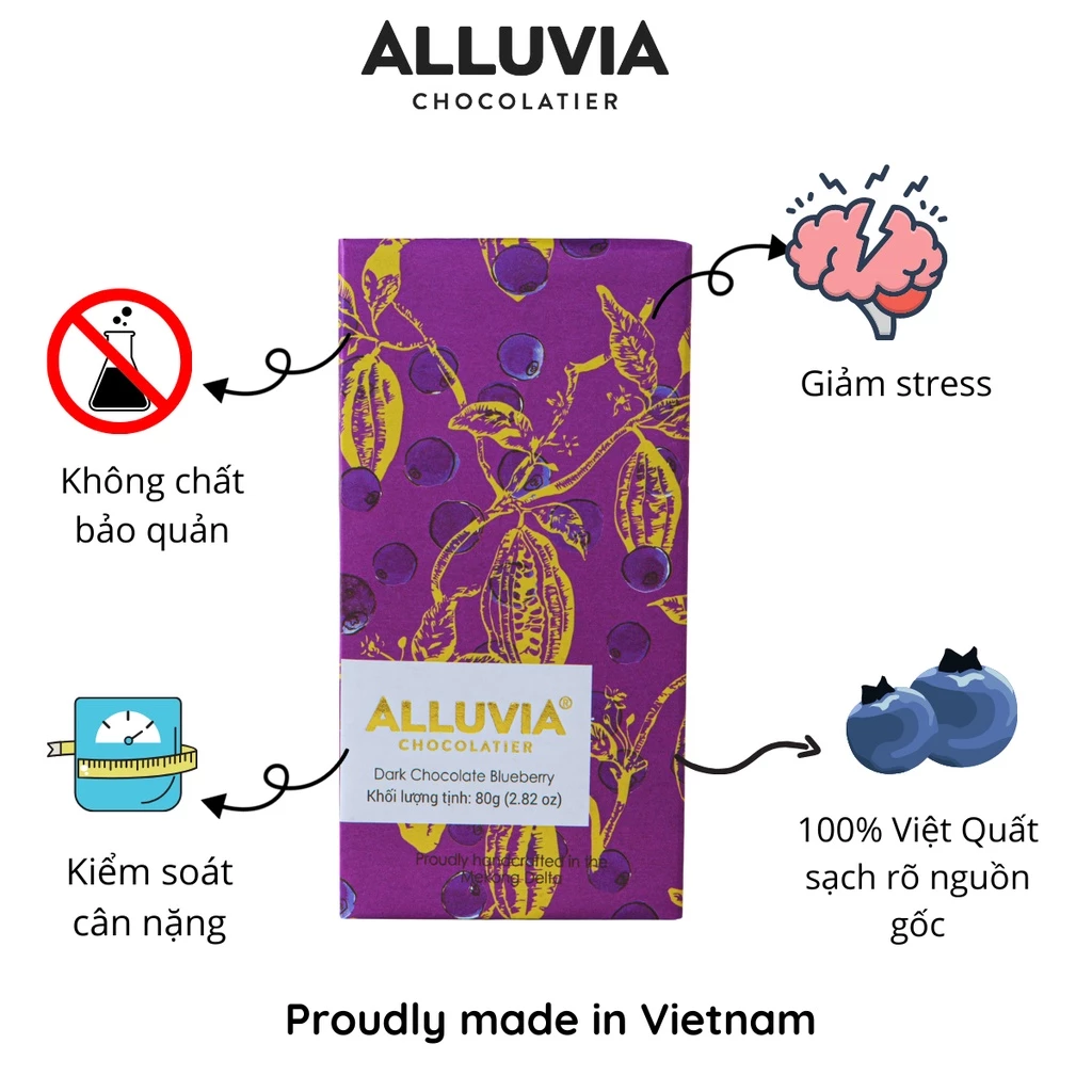 食通たちの世界では、チョコレートは単なるデザートではなく、美食の芸術を語る言語です。アルーヴィアのダークチョコレート70% ブルーベリーは、まさに完璧なシンフォニー。肥沃なメコンデルタの土壌で育まれたカカオの力強い苦味と、西洋の気品あるジューシーなブルーベリーが織りなすハーモニーをお楽しみいただけます。たった30gの小さな板の中に、ベトナムの誇る「Bean-to-bar(カカオ豆からチョコレートまで一貫製造)」の精神が凝縮されています。