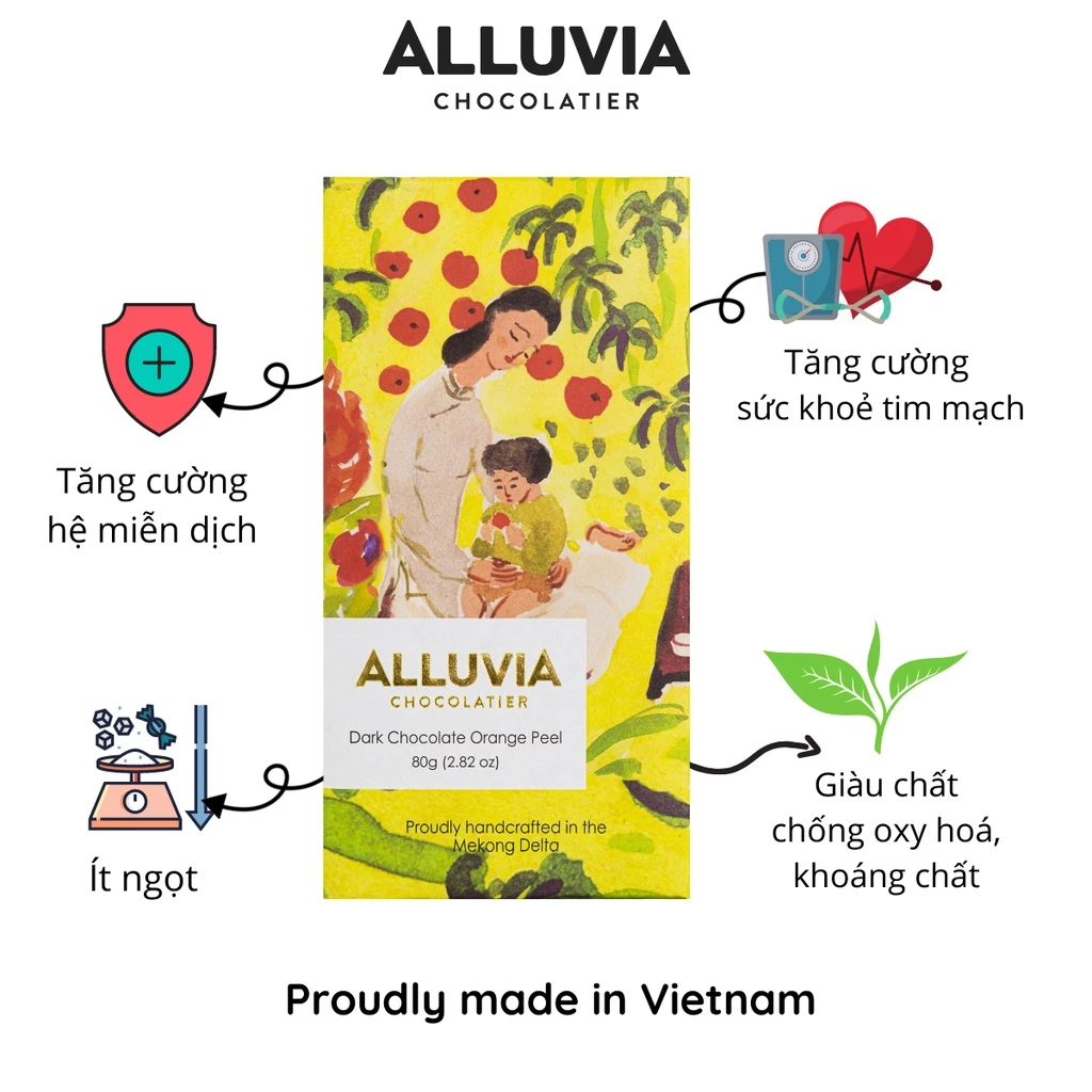 「Alluvia ダークチョコレート オレンジピール 70%カカオ」は、ベトナムの手作りチョコレートの誇りです。30gの可愛らしいバーに、ティエンザン省産カカオの豊かな風味と、しっとりとした爽やかなオレンジピールが詰まっています。一般的な甘すぎるお菓子とは異なり、カカオのほろ苦さとオレンジのフレッシュな香りの完璧なバランスを追求しました。このダークチョコレートは、単に甘いものへの欲求を満たすだけでなく、心と体に素晴らしい効果をもたらします。