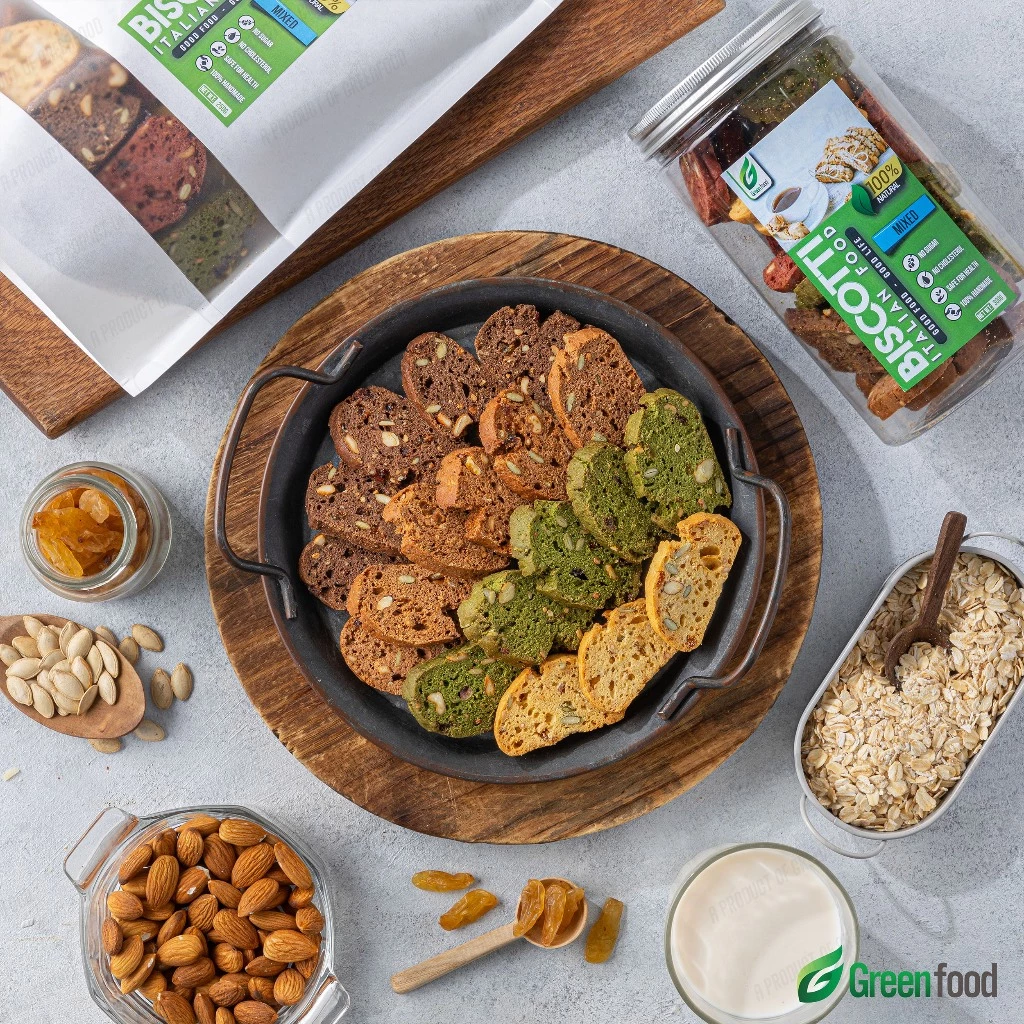 - ミックスナッツ: 香ばしいスライスアーモンド、カリッとしたカシューナッツ、栄養豊富なかぼちゃの種がビスコッティの「魂」とも言える独特の風味を作り出します。