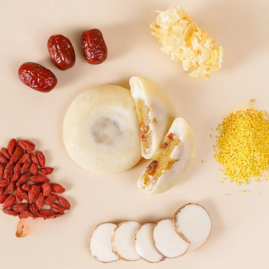 トレメラ(白きくらげ)、なつめ、クコの実、蓮の実、ハトムギ、天然甘味料(ステビア、低カロリー麦芽糖など)、植物性ゼラチンまたは餅米粉。