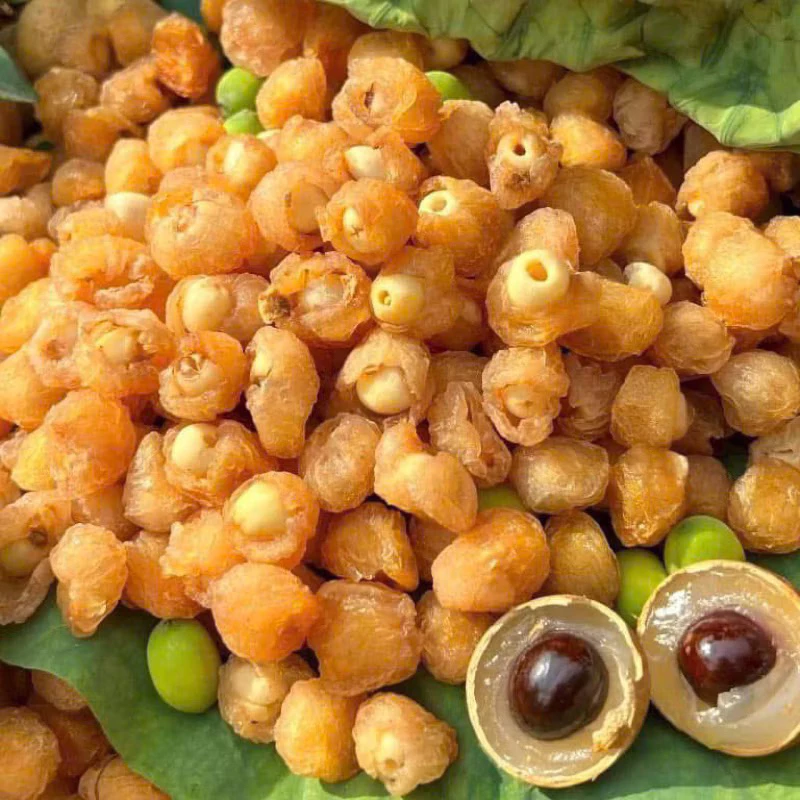 フーヒエン – フンイエン地方が誇る名物「蓮の実入り龍眼肉」は、単なるおやつではありません。これは、熟練の職人技が光る繊細な芸術品です。一つ一つの完熟した肉厚な龍眼の種を丁寧に外し、その中に柔らかく煮るか、パリッと乾燥させた蓮の実を優しく「抱きしめる」ように閉じ込めています。500gのジップパックを開けると、琥珀色に輝く龍眼が、その中に優しく包み込まれた乳白色の蓮の実の姿が現れます。一口食べれば、龍眼の蜜のようなとろける甘さと、蓮の実の持つ独特の香ばしく豊かな風味が口の中で見事に調和し、忘れられない感動を与えてくれるでしょう。