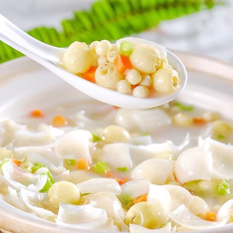 • 煮込み料理:豚足、烏骨鶏、鳩肉などと一緒に煮込むと、甘くまろやかなスープとホクホクとしたハスの実が絶妙な滋養強壮スープになります。