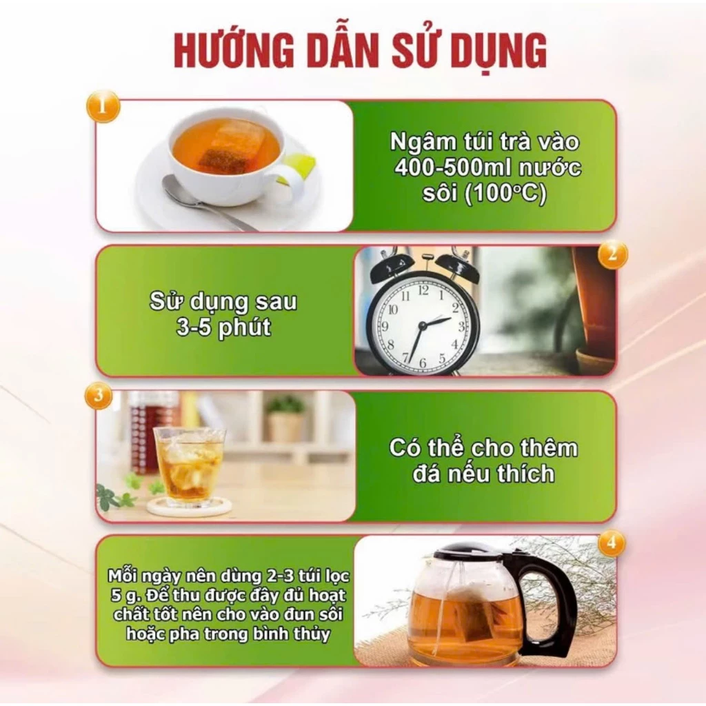 4. お召し上がり: 温かいままお腹を温めるために飲んでも、氷を加えて爽やかな冷たい飲み物としてもお楽しみいただけます。身体の変化を実感するために、毎日1〜2袋を継続して飲むことをお勧めします。