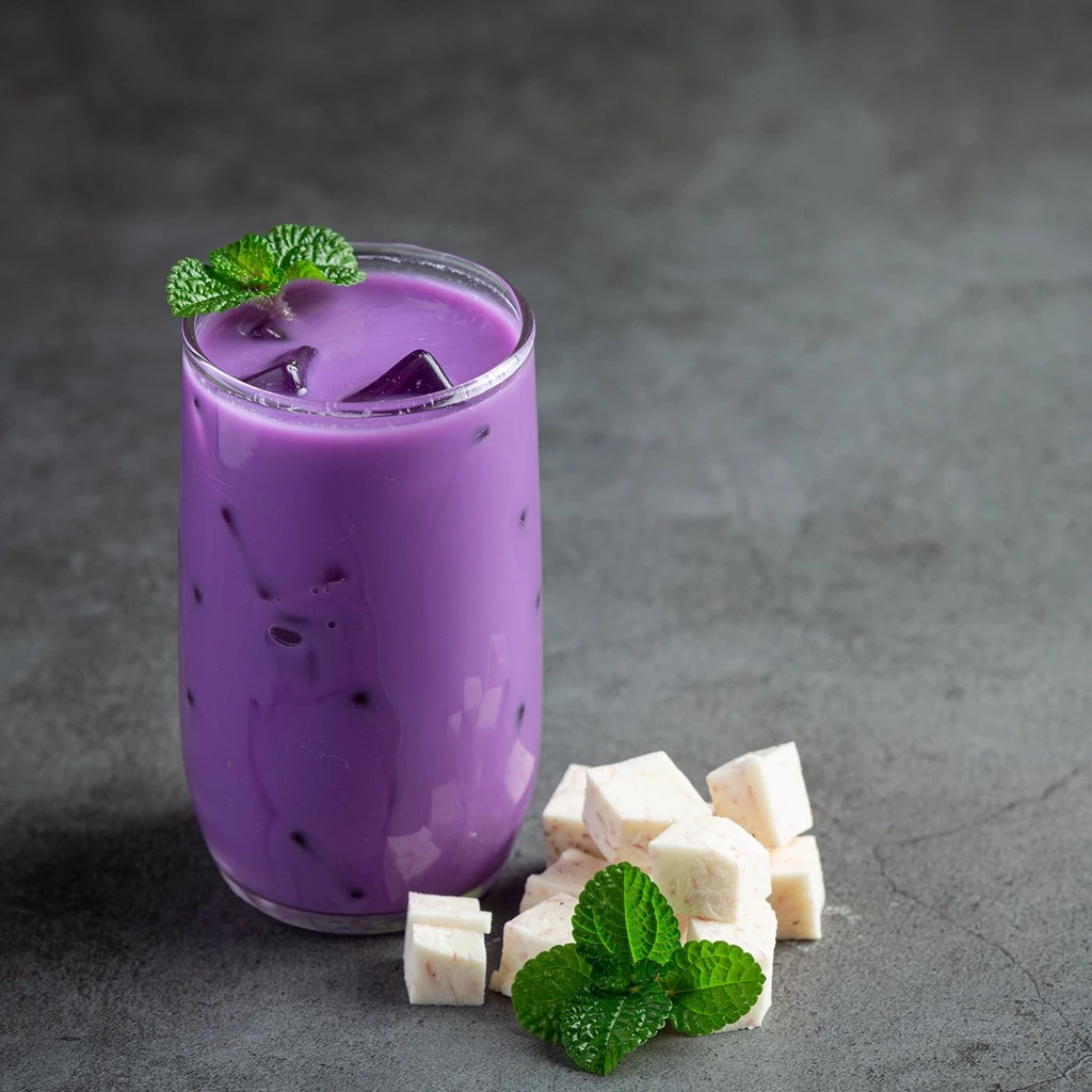 - "トレンド"のミルクティーに:パウダー1〜2スプーンをミルクティーのベースや黒糖タピオカミルクに溶かします。美しい紫色になるだけでなく、紫芋特有のまろやかな風味を加えます。
