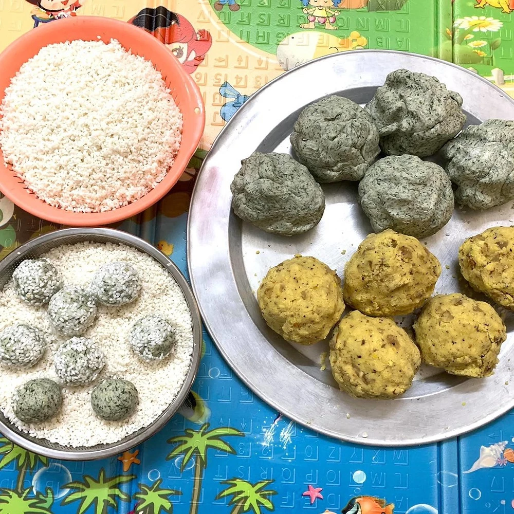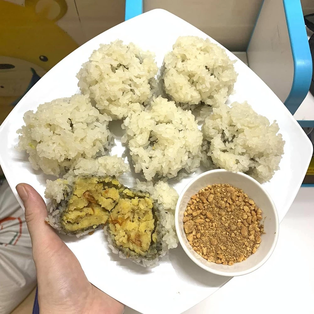3. バン・クックを作る: 緑豆と豚バラ肉の餡を生地で包み込み、白いもち米をまぶします。その後、蒸し器で蒸し上げます。