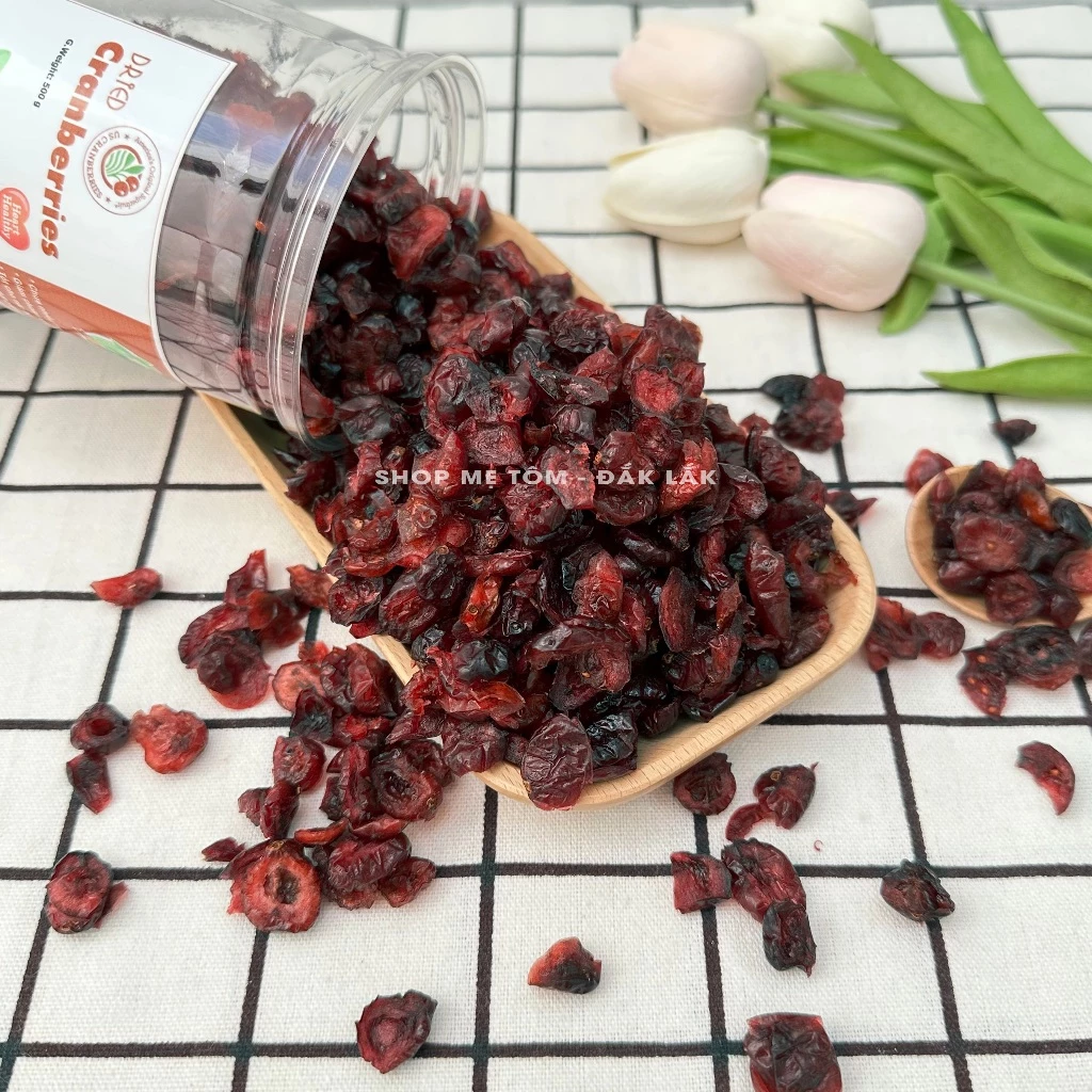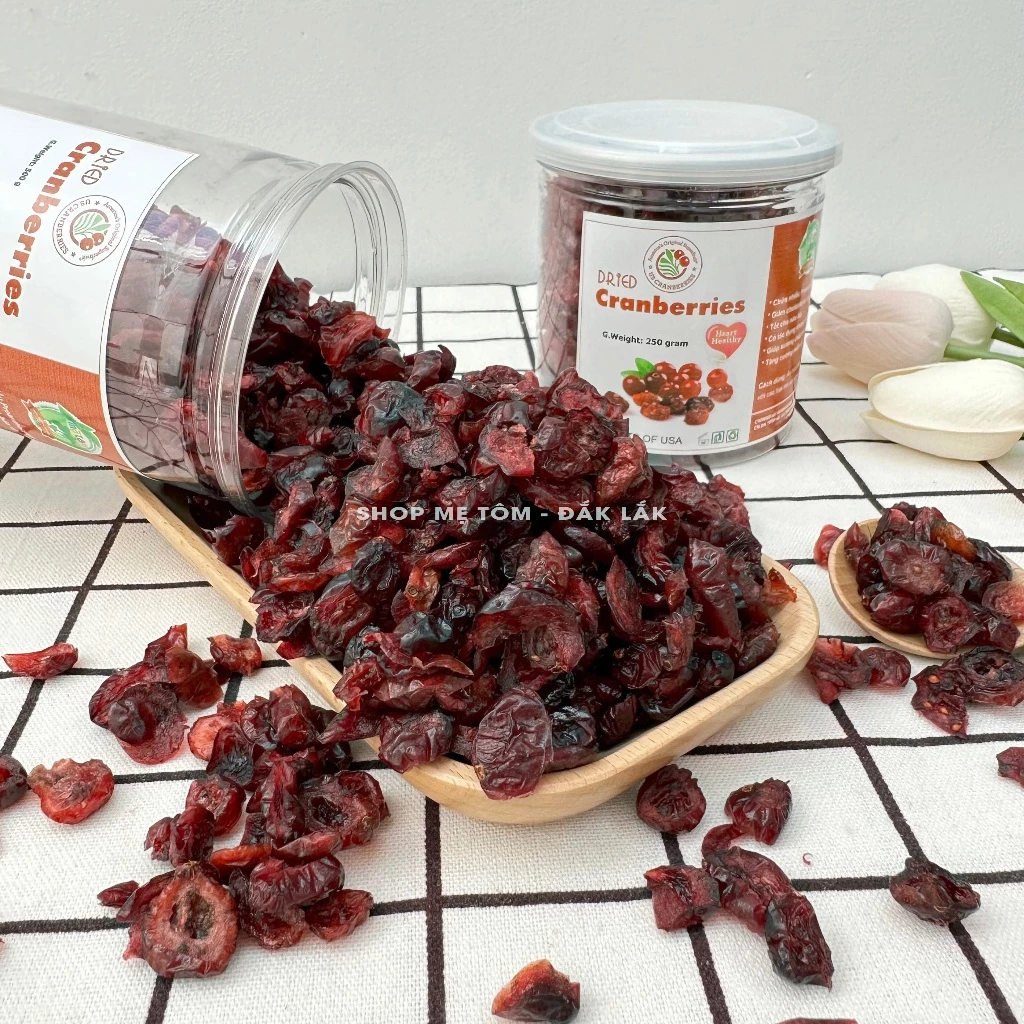 Shop Mẹ Tômのクランベリーは、国際基準を満たす産地から厳選された原料を使用しています。完熟した赤いクランベリーを一粒一粒丁寧に収穫し、独自のソフトドライ製法で、水分を理想的な状態にまで減らしつつ、しっとりとした瑞々しさを保ちます。触れると柔らかく、光沢があり、軽く噛むと弾力のある果肉が口の中で広がり、特徴的な酸味と爽やかさが舌の上でとろけます。250g入りのPETボトルは頑丈なデザインで、密閉性の高い蓋が「瑞々しい」食感を完璧に保護し、果実が乾燥したり品質が変化するのを防ぎます。