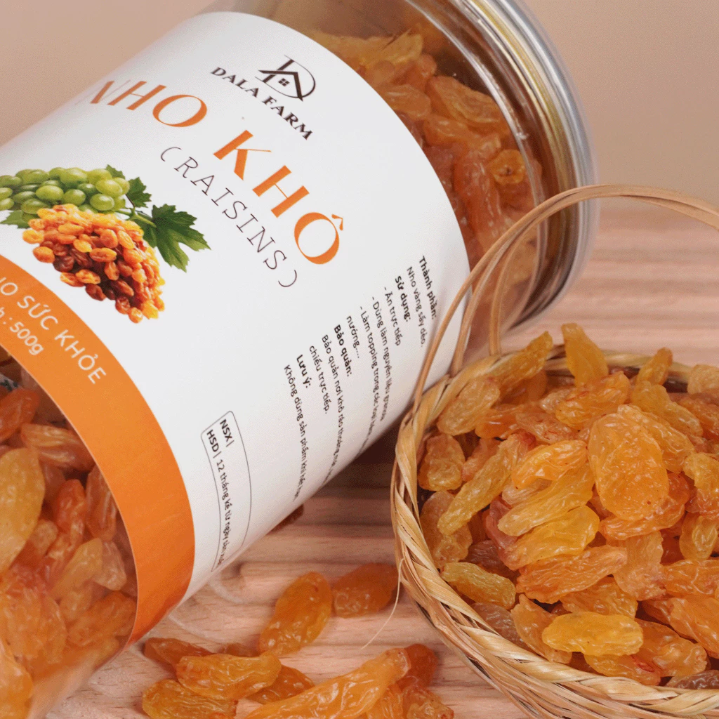 「Combo 2 hũ 500g Nho Khô Vàng Sấy DALA」は、まるで夕焼けのような輝きを放つ、一粒一粒に太陽の恵みが凝縮された特別なドライフルーツです。