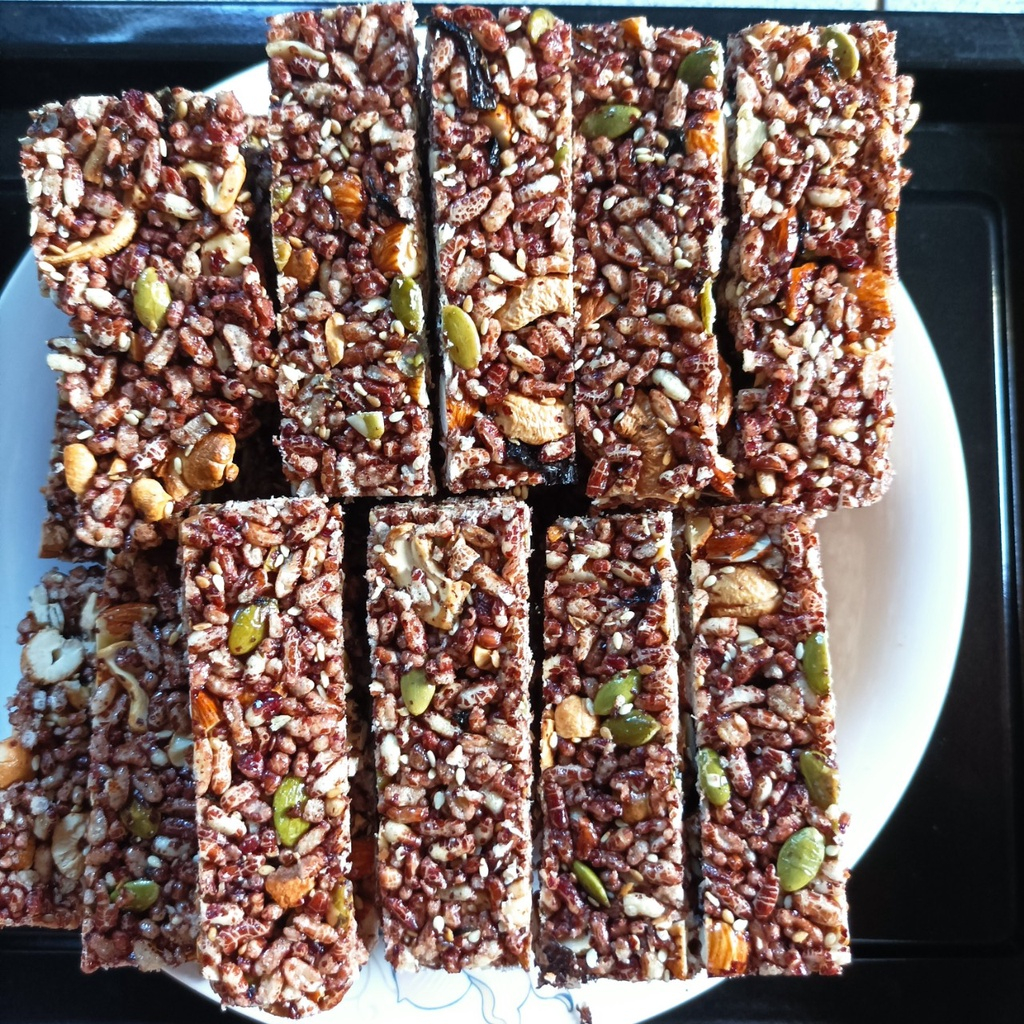 玄米、メロンの種、カボチャの種、カシューナッツ、ヒマワリの種、ゴマ、モルト、ココナッツオイル、綿のスクラブ